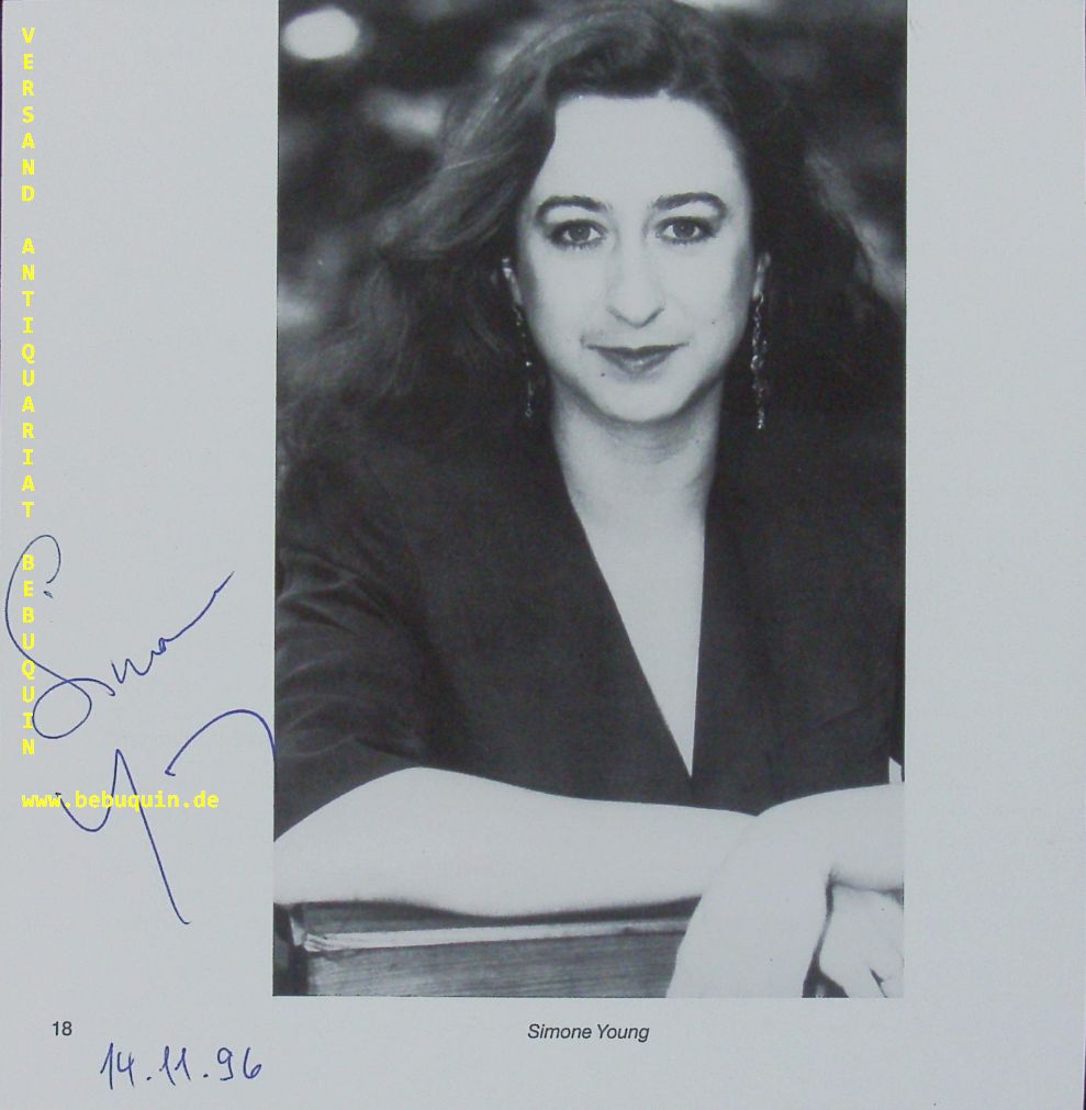 YOUNG, Simone (Dirigentin): eigenhändig signierte und datierte Portraitseite. München (Herkulessaal), 14.11.1996. 18,5 x 18,5 cm. 1 Bl. Simone Young (* 2. März 1961 in Sydney) ist eine australische Dirigentin, Opernintendantin und Hochschulprofessorin. (Wikipedia)