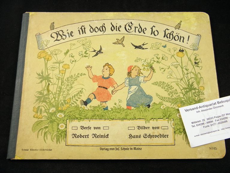 SCHOLZ DEUTSCHE BILDERBÜCHER.– REINICK, Robert: Wie ist doch die Erde so schön! Mainz (Jos. Scholz), ca 1910. Quer 4°. 16 S. mit 8 farb. Bildtafeln von Hans Schroedter. farb. ill. OHLn. Einband etwas fleckig, Gelenke leicht gelockert, letzte Seite mit kleinem Randeinriss. = No. 65. EA.
