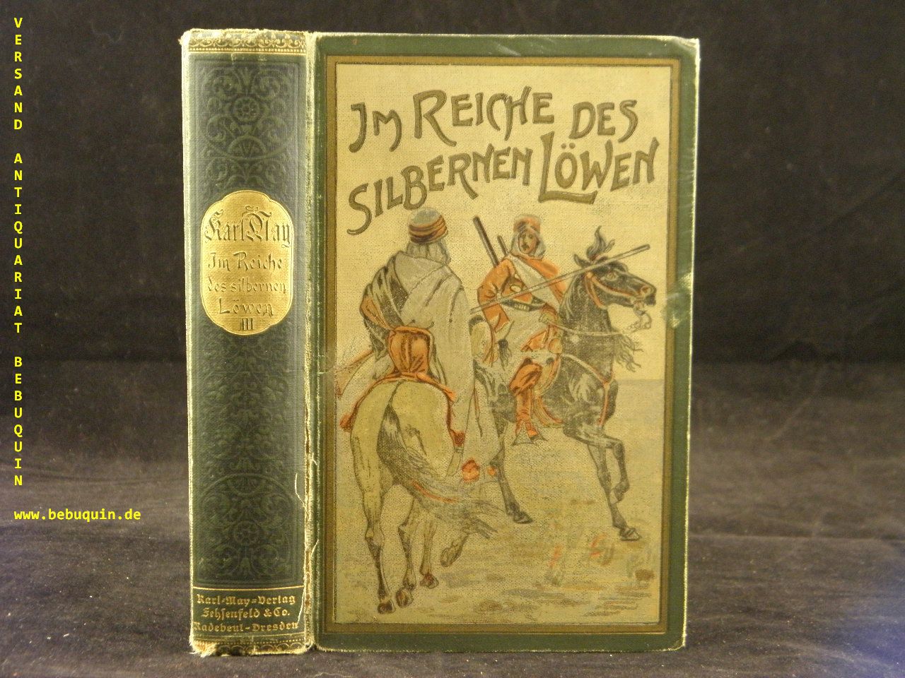 MAY, Karl: Im Reiche des silbernen Löwen. III. Band. Reiseerlebnisse. 26.– 27. Tsd. Freiburg (Fehsenfeld), (1913). 636 S. mit den goldenen Vorsätzen. ill. OLn. (DB 80). Rücken ca 5 cm angeplatzt, vorderes Gelenk etwas gelockert, sonst gut erhalten mit goldglänzendem Rücken. = Gesammelte Werke, Bd. XXVIII. Die letzte seltene Fehsenfeld-Ausgabe Plaul 352.6.
