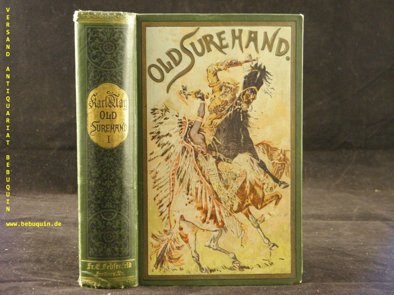 MAY, Karl: Old Surehand. 1. Band. Reiseerlebnisse. 21.– 25. Tsd. Freiburg (Fehsenfeld), (1899) 644 S. farb. ill. OLn. mit goldglänzendem Rücken. Plaul 66. Marke auf Vorsatz, innen zwei hinterlegte Einrisse. = Gesammelte Reiseerzählungen, Bd. XIV. Plaul 261.4.