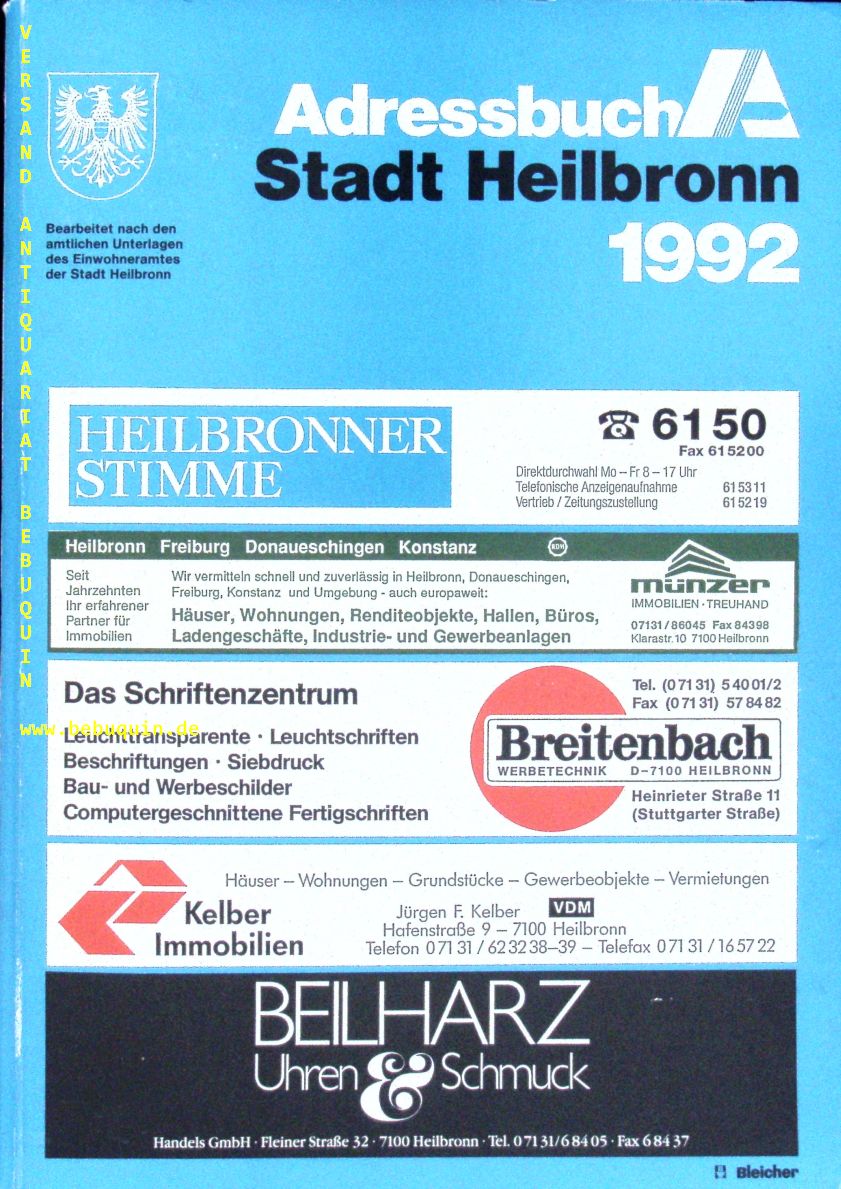 HEILBRONN.– ADRESSBUCH DER STADT HEILBRONN 1990.– Gerlingen (Bleicher), 1990. 4°. 40, 32, 336, 40, 176, 56 S. ill. OKart. gut erhalten. Enthält Namen- und Firmenteil, Straßen- und Häuserteil, Branchen- und Behördenteil.