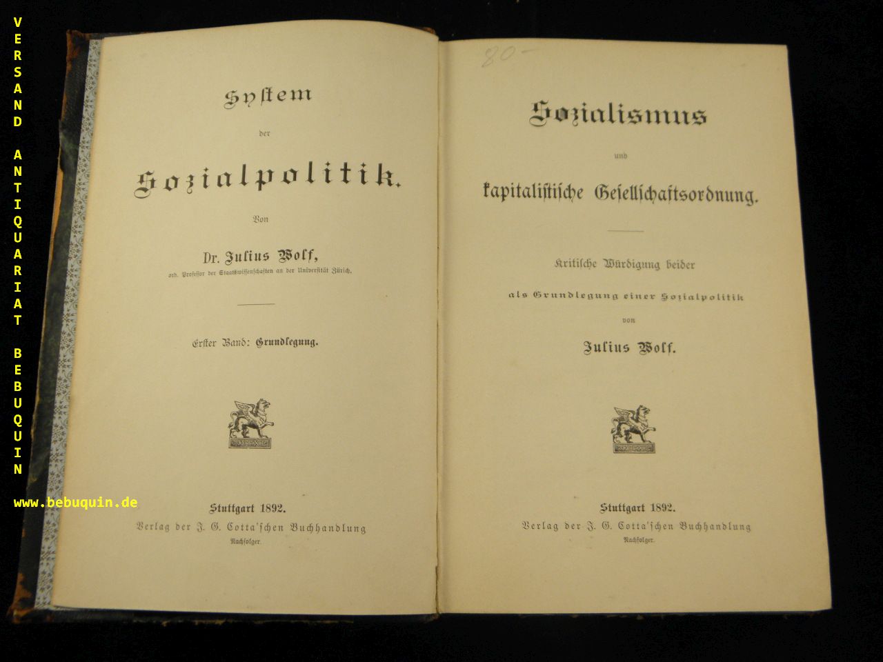 WOLF, Julius: Sozialismus und kapitalistische Gesellschaftsordnung. Kritische Würdigung beider als Grundlegung einer Sozialpolitik. Stuttgart (Cotta), 1892. XIX, 620 S. OHLdr mit goldgeprägtem Rücken. Kanten berieben. = System der Sozialpolitik, 1. Bd. EA.