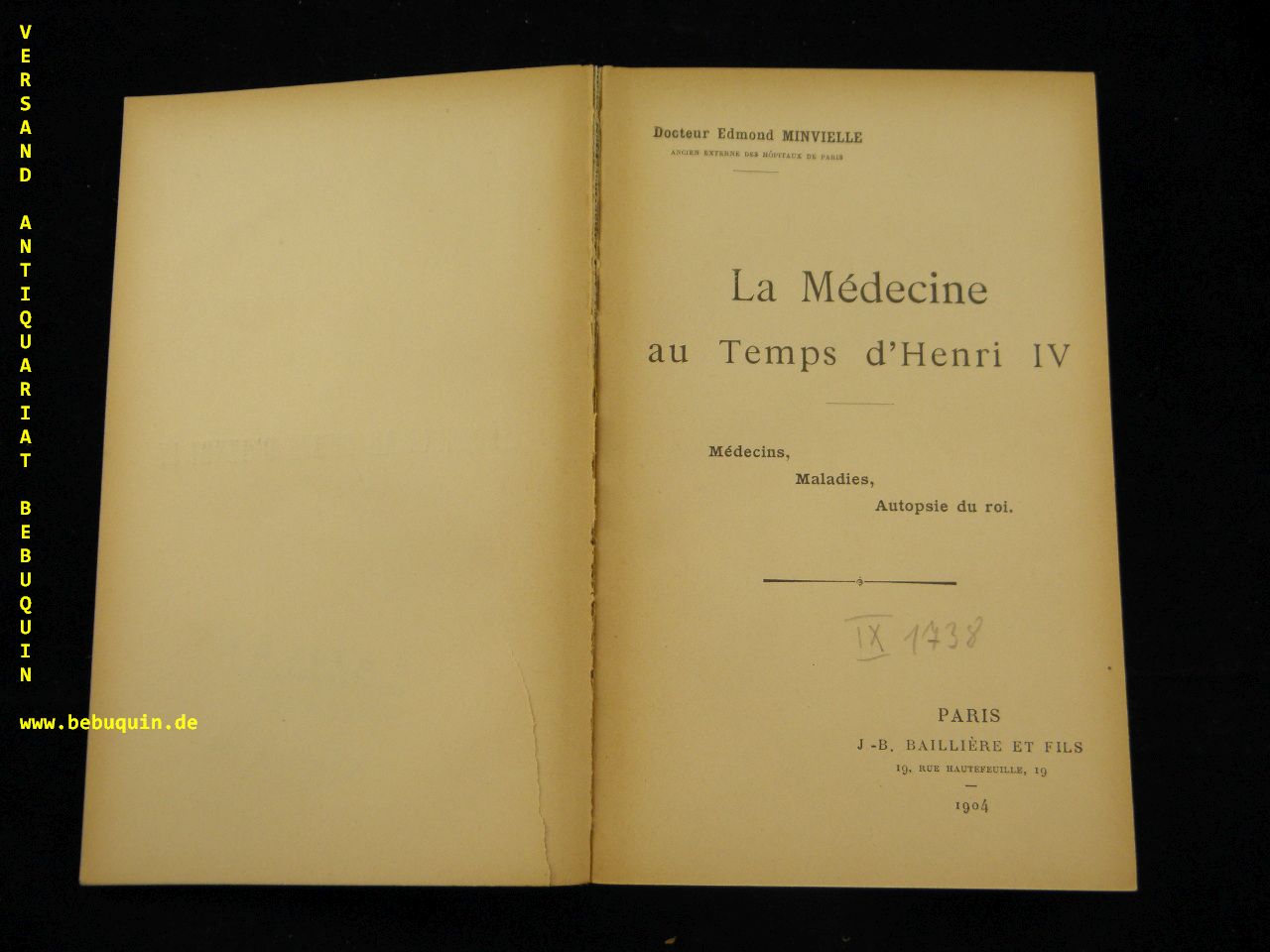 MEDIZIN.– MINVIELLE, Edmond: La Médecine au Temps d’Henri IV. Médecins, maladies, Autopsie du roi. Paris (Bailliere), 1904. 203 S. HLn der Zeit. Ordnungsgemäß ausgesondertes Bibliotheksexemplar (Rückenschild, Stempel). EA.
