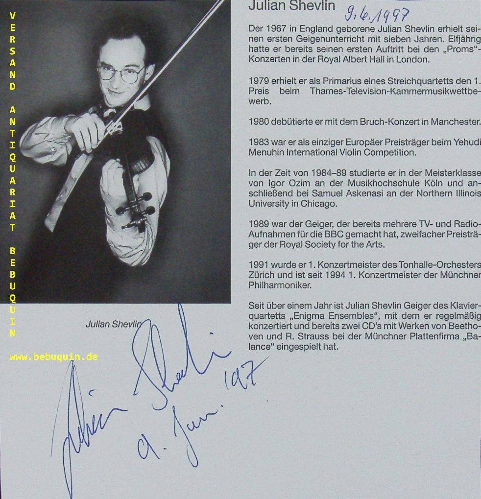 SHEVLIN, Julian (Violinist): eigenhändig signierte und datierte Portraitseite. München (Philharmonie), 9.6.1997. 17 x 16,5 cm. 1 Bl. Der 1967 in England geborene Julian Shevlin erhielt seinen ersten Geigenunterricht mit 7 Jahren. Bereits 11-jährig trat er erstmals bei den „Proms“-Konzerten in der Royal Albert Hall in London auf. 1980 debütierte er als Solist mit dem Bruch-Konzert in Manchester. 1983 war er als einziger Europäer Preisträger beim Yehudi-Menuhin-Wettbewerb. (Wikipedia)