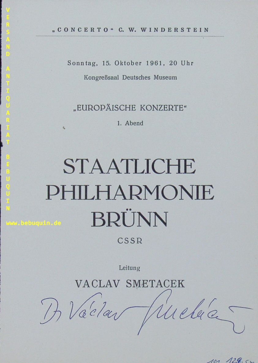 SMETACEK, Vaclav (Dirigent): eigenhändig signierte und datierte Programmseite. Mit der staatlichen Philharmonie Brünn. München (Kongresssaal), 15.10.1961. 21 x 15 cm. 1 Bl. Václav Smetácek (* 30. Juni 1906 in Brünn; † 18. Februar 1986 in Prag) war ein tschechischer Dirigent, Komponist und Oboist. Smetácek studierte ab 1922 am Prager Konservatorium Klavier, Oboe, Musiktheorie und Orchesterleitung. Sein dortiger Oboenlehrer war Ladislav Skuhrovsky. 1928 bis 1932 folgten weitere Studien an der Prager Karlsuniversität. Mit Konservatoriumskollegen gründete er 1928 das Prager Bläserquintett, für das er auch komponierte und arrangierte, und dessen Mitglied er bis 1960 blieb. (Wikipedia)