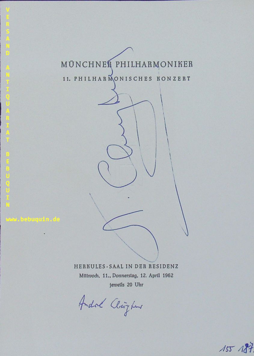 CLUYTENS, André (Dirigent): eigenhändig signiertes Programm. München, 11.4.1962, 20,5 x 14,5 cm. 2 Bl. . André Cluytens (* 26. März 1905 in Antwerpen; † 3. Juni 1967 in Neuilly-sur-Seine) war ein belgisch-französischer Dirigent. (Wikipedia)