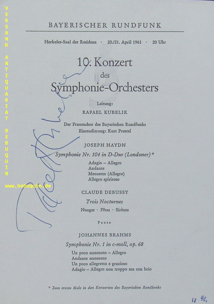 KUBELIK, Rafael (Dirigent): eigenhändig signierte Programmseite. München (Herkulessaal), 20.4.1961. 21 x 15 cm. 1 Bl. Jeroným Rafael Kubelík (* 29. Juni 1914 auf Schloss Horskyfeld in Býchory, Böhmen; † 11. August 1996 in Kastanienbaum, Kanton Luzern) war ein tschechisch-schweizerischer Dirigent und Komponist. (Wikipedia)
