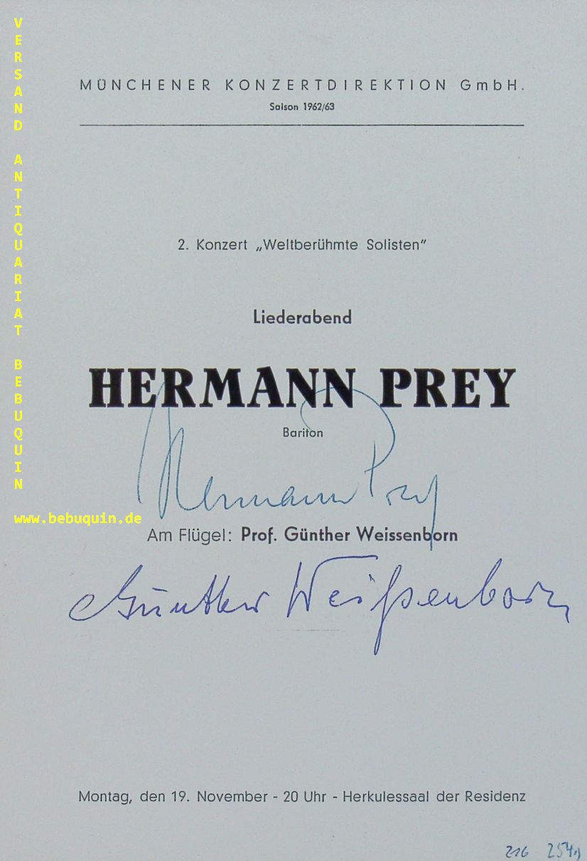 WEISSENBORN, Günther (Pianist) + PREY, Hermann (Bariton): eigenhändig von beiden signierte Programmseite. München, 19.11.1962. 21 x 14 cm. 1 Blatt. Hermann Oskar Karl Bruno Prey (* 11. Juli 1929 in Berlin; † 22. Juli 1998 in Krailling) war ein deutscher Opernsänger (Bariton). Günther Weißenborn (* 2. Juni 1911 in Coburg; † 25. Februar 2001 in Detmold) war ein deutscher Pianist, Liedbegleiter und Dirigent. (Wikipedia)