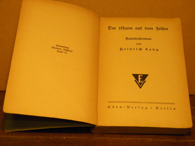 LANG, Heinrich: Der Mann auf dem Felsen. Kriminalroman. Berlin (Eden), (1934). 238 (2) S. Kart. der Zeit. Rücken gebräunt, Ecken leicht bestoßen. = Sammlung Moderner Bücherei., Bd. 25. sehr seltene EA. (Schädel 4587)