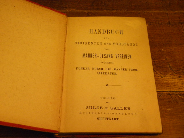 HANDBUCH FÜR DIRIGENTEN UND VORSTÄNDE VON MÄNNER-GESANG-VEREINEN.– Zugleich Führer durch Männer-Chor-Literatur. Stuttgart (Sulze & Galler), ca 1900. kl. 8°. 2 B., 128 S. ill. OPb. Rücken überklebt, bestaubt, einige (interessante) Marginalien vom Musikdirektor Gammel aus Kornwestheim. EA.