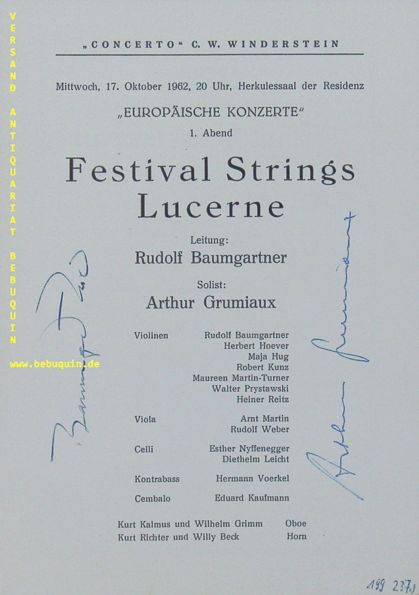 GRUMIAUX, Arthur (Violinist) + BAUMGARTNER, Rudolf (Dirigent): eigenhändig von beiden signierte Programmseite. München (Herkulessaal), 17.10.1962. 21 x 15 cm. Faltblatt. Arthur Grumiaux (* 21. März 1921 in Villers-Perwin, Belgien; † 16. Oktober 1986 in Brüssel) war ein belgischer Violinist und Dirigent. Rudolf Baumgartner (* 14. September 1917 in Zürich; † 22. März 2002 in Siena) war ein Schweizer Violinist, Dirigent und Bearbeiter von Werken klassischer Musik. (Wikipedia)