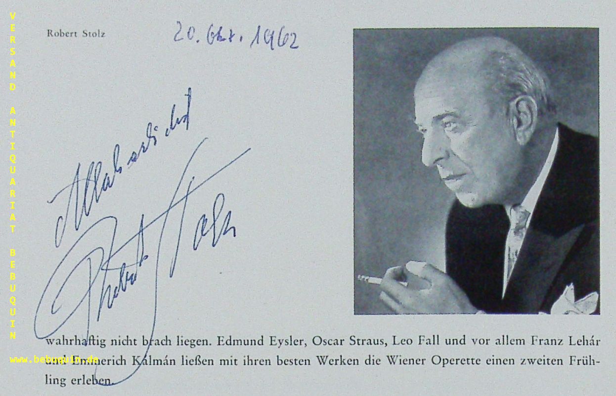 STOLZ, Robert (Komponist): eigenhändig signiertes Programmheft: Allerherzlichst. An den jeweiligen Portraits ebenfalls signiert von Heinz Hoppe und Sari Barabas. München (BR), 20.10.1962. 21 x 15 cm. 8 S. mit zahlr. Bildern. OKart. Robert Elisabeth Stolz (* 25. August 1880 in Graz; † 27. Juni 1975 in Berlin) war ein österreichischer Komponist und Dirigent. (Wikipedia)