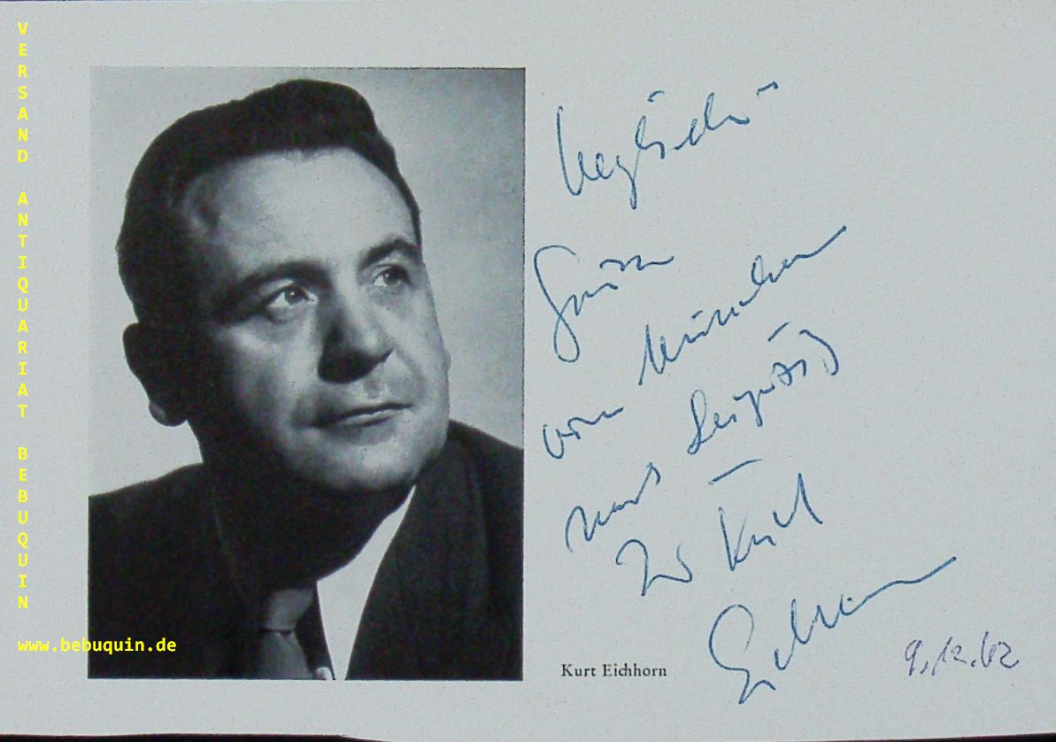 EICHHORN, Kurt (Dirigent): eigenhändig signierte Portraitseite mit Herzlichen Grüßen von München nach Leipzig Mit Gil Shaham. München (Philharmonie), 9.12.1962. 10,5 x 15 cm. 1 Bl. Kurt Peter Eichhorn (* 4. August 1908 in München; † 29. Juni 1994 in Murnau) war ein deutscher Dirigent. (Wikipedia)