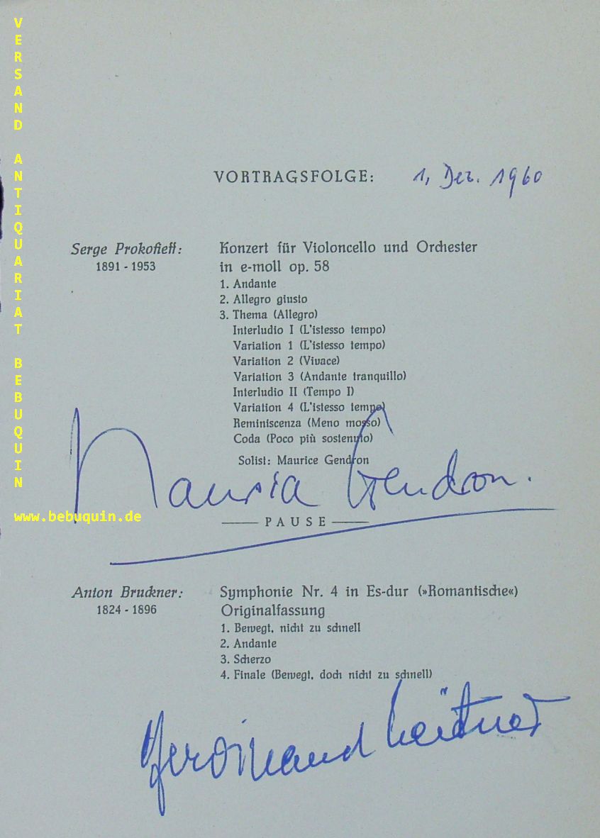 GENDRON, Maurice (Cellist) + LEITNER, Ferdinand (Dirigent) eigenhändig von beiden signierte Programmseite. München, 4.12.1960. 21 x 15 cm. 1 Blatt. Maurice Gendron (* 26. Dezember 1920 in Nizza; † 20. August 1990 in Grez-sur-Loing, Département Seine-et-Marne) war ein französischer Cellist. Ferdinand Leitner (* 4. März 1912 in Berlin; † 3. Juni 1996 auf der Forch bei Zürich) war ein deutscher Dirigent. (Wikipedia)