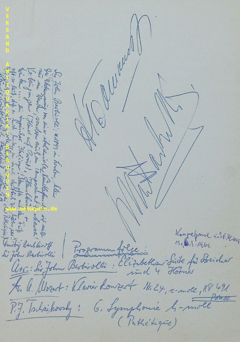 BARBIROLLI, Sir John (Cellist, Dirigent): eigenhändig signierte Programmseite. München (Kongresssaal), 17.3.1961. 21 x 15 cm. 1 Bl. Sir John (Giovanni Battista) Barbirolli (* 2. Dezember 1899 in London; † 29. Juli 1970 ebenda) brit. Dirigent, u.a. 1937-43 Chefdirigent des New York Philharmonic Orchestra als Nachfolger A. Toscaninis, Chefdirigent des Hallé Orchesters 1943-70. (Wikipedia)