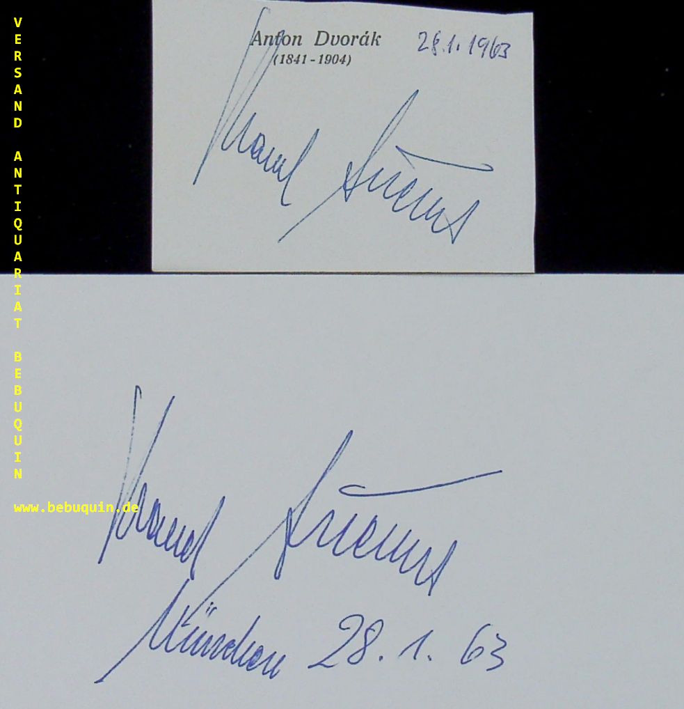 ANCERL, Karel (Dirigent): eigenhändig signierte und datierte Autogrammkarte. Beiliegend 1 kleines Blatt mit weiterer Signatur vom selben Tag. München, 28.1.1963. 8 x 12,5 cm. 2 Bl. Karel Ancerl (ursprünglich Antscherl, geboren 11. April 1908 in Tucapy, Österreich-Ungarn; gestorben 3. Juli 1973 in Toronto, Kanada) war ein tschechischer Dirigent. Er war viele Jahre Leiter der Tschechischen Philharmonie. (Wikipedia)