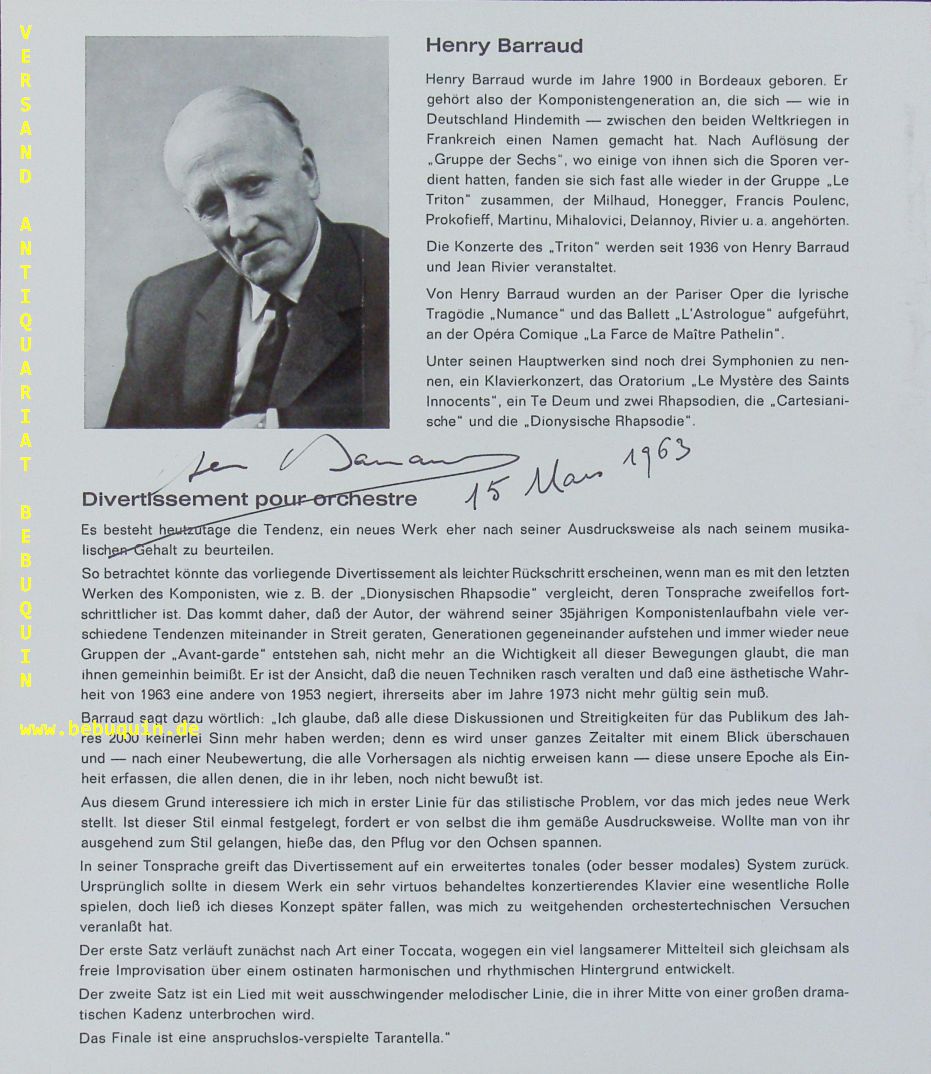 BARRAUD, Henry (Komponist): eigenhändig signierte und datierte Portraitseite. München (Herkulessaal), 15.3.1963. 23,5 x 21 cm. 1 Bl. Henry Barraud (* 23. April 1900 in Bordeaux, Frankreich; † 28. Dezember 1997 in Saint-Maurice (Val-de-Marne)) war ein französischer Komponist. (Wikipedia)