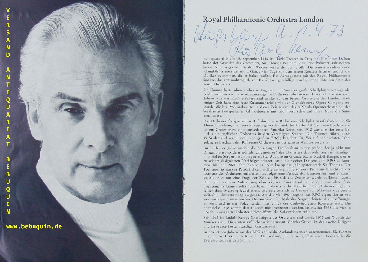 KEMPE, Rudolf (Dirigent): eigenhändig signiertes und datiertes Programmblatt. Augsburg, 1.4.1973. 20 x 15 cm. 3 Bl. Rudolf Kempe (* 14. Juni 1910 in Dresden; † 12. Mai 1976 in Zürich) war ein deutscher Dirigent. (Wikipedia)