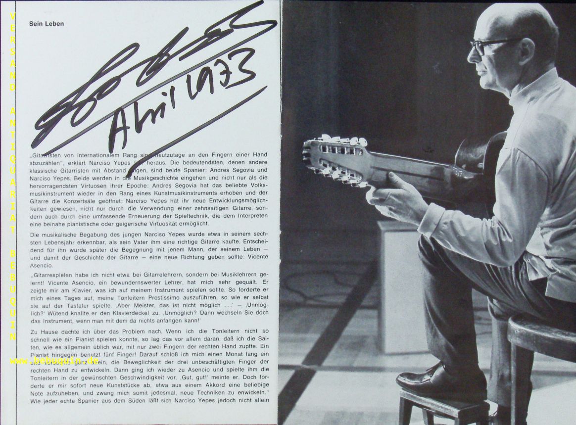 YEPES, Narciso (Gitarrist): zweimal eigenhändig signierte und datierte Programmseiten. München, 4.4.1973 3 Bl. Narciso García Yepes (* 14. November 1927 in Lorca; † 3. Mai 1997 in Murcia) war ein spanischer klassischer Gitarrist, Lautenist, Arrangeur und Komponist. Mit Andrés Segovia und Miguel Llobet gehört er zu den größten Gitarristen Spaniens. Er spielte auf einer zehnsaitigen Gitarre, welche er mit dem Gitarrenbauer José Ramírez III entwickelte. 1952 arrangierte er die Musik zum Oscar-prämierten Film Verbotene Spiele (Jeux interdits). (Wikipedia)