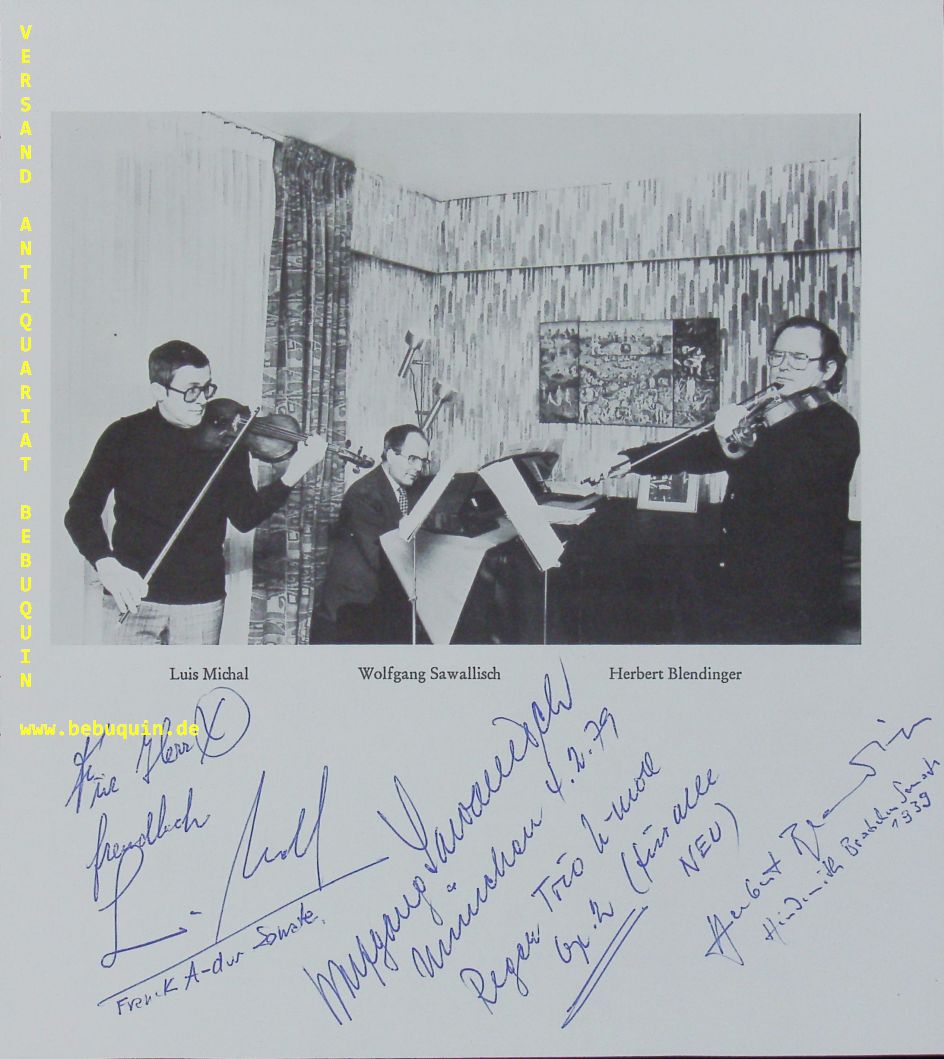 SAWALLISCH, Wolfgang (Dirigent) + MICHAL, Luis (Violinist) + BLENDINGER, Herbert (Komponist): eigenhändig von allen signierte und datierte Portraitseite als Reger Trio (für alle NEU). München, 4.2.1979. 23 x 21 cm. 1 Bl. Wolfgang Sawallisch (* 26. August 1923 in München; † 22. Februar 2013 in Grassau) war ein deutscher Dirigent und Pianist. Herbert Blendinger (* 3. Januar 1936 in Ansbach; † 15. Mai 2020) war ein österreichischer Komponist und Bratschist deutscher Herkunft. (Wikipedia)