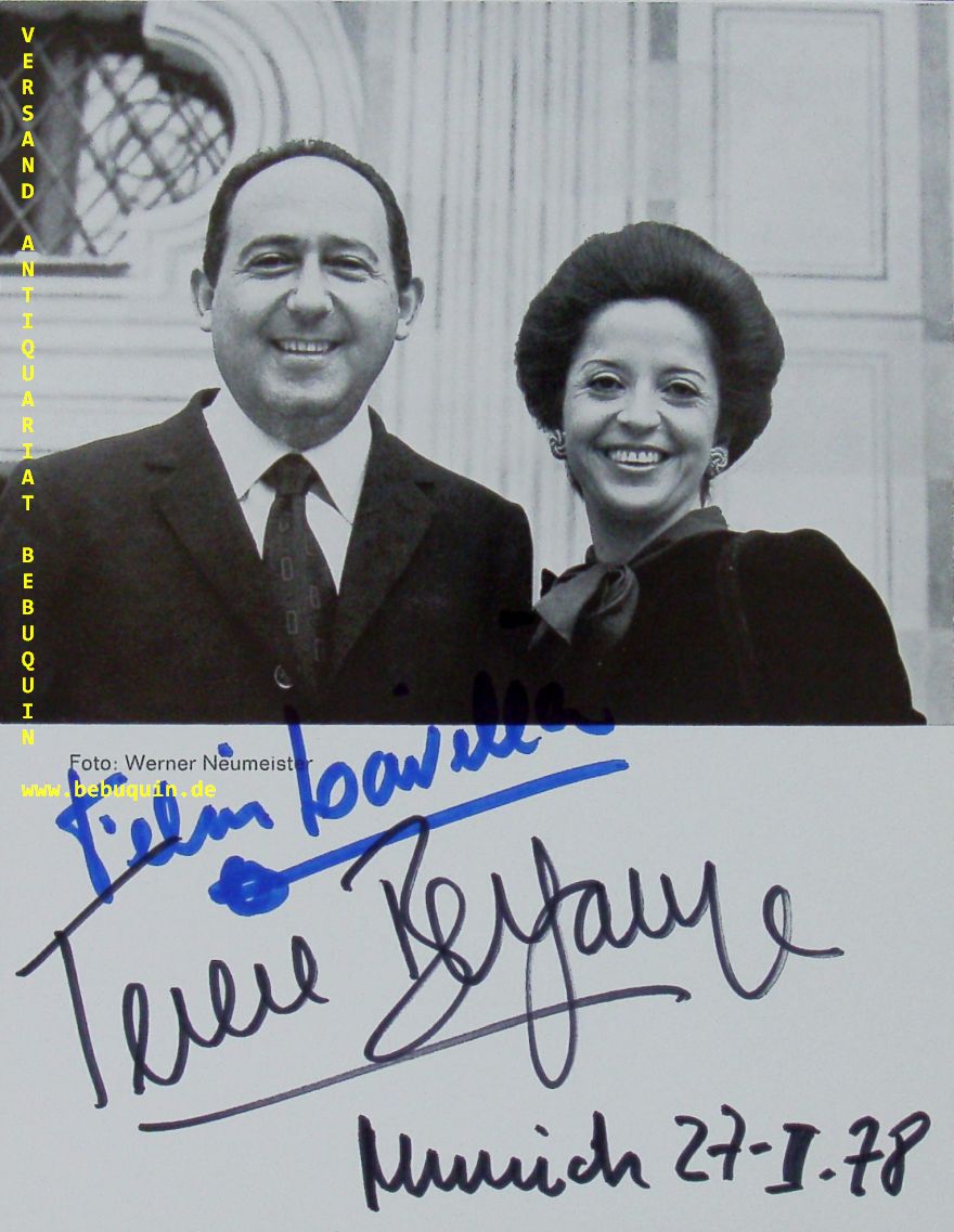 BERGANZA, Teresa (Mezzosopran) + LAVILLA, Felix (Pianist): eigenhändig von beiden signiertes und datiertes Portrait aus Programmheft. München (Herkulessaal), 27.2.1978. 19 x 15 cm. 1 Bl. María Teresa Berganza Vargas (* 16. März 1935 in Madrid) ist eine spanische Opernsängerin (Mezzosopran). Sie ist insbesondere bekannt für Rollen in Opern von Rossini, Mozart und Bizet und ragt heraus durch ihre technische Virtuosität, ihre musikalische Intelligenz und eindrucksvolle Bühnenpräsenz. (Wikipedia)