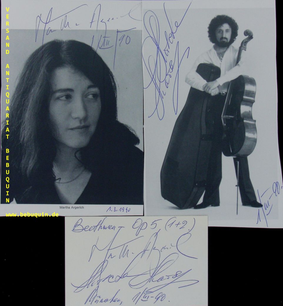 ARGERICH, Martha (Pianistin) + MAISKY, Mischa (Cellist): eigenhändig von beiden signierte und datierte Autogrammkarte sowie jeweils eine signierte und datierte Portraitseite.. München (Herkulessaal), 1.3.1990. 8 x 12,5 + 21 x 15 cm. 3 Bl. Martha Argerich (* 5. Juni 1941 in Buenos Aires) ist eine argentinisch-schweizerische Pianistin. Im Jahr 2005 erhielt sie die Auszeichnung Praemium Imperiale, den „Nobelpreis der Künste“. Im Jahr 2014 wurde sie mit dem ECHO Klassik in der Kategorie „Konzerteinspielung des Jahres (Klavier)“ mit dem Orchestra Mozart Bologna unter Claudio Abbado für Mozarts Klavierkonzerte 20 & 25 ausgezeichnet. 2016 erhielt sie den Kennedy-Preis. Mischa Maisky (* 10. Januar 1948 in Riga, Sowjetunion, heute Lettland) ist ein klassischer Cellist und gilt als einer der besten Cellisten der Gegenwart. Er lebt heute in Waterloo bei Brüssel. (Wikipedia)