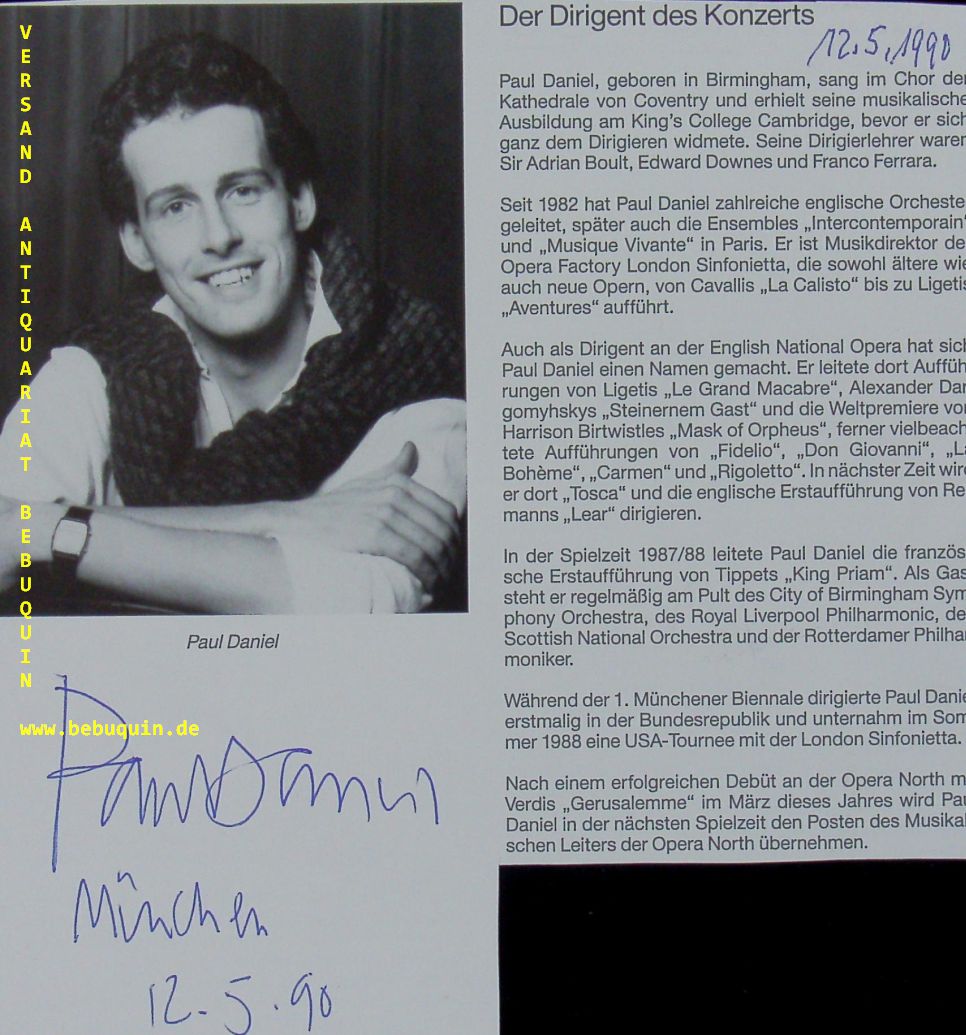 DANIEL, Paul (Dirigent): eigenhändig signierte und datierte Portraitseite. München, 12.5.1990. 18 x 16 cm. 1 Bl. Paul Daniel (born 5 July 1958) is an English conductor. (Wikipedia)