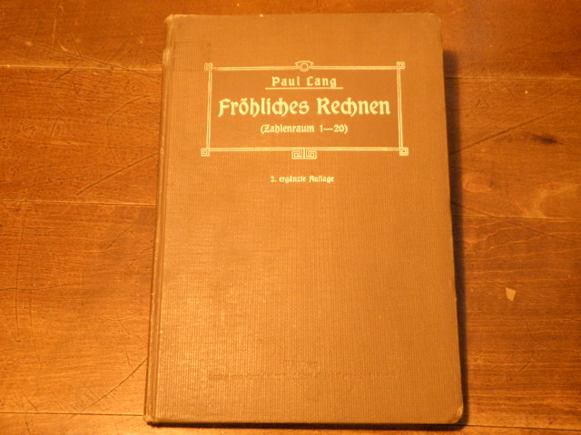 RECHENBUCH.– LANG, Paul: Fröhliches Rechnen. (Zahlenraum 1 – 20). Ein Beitrag zur Methodik des ersten Rechenunterrichts. 2. ergänzte Aufl. Würzburg (Kabitzsch), 1914. Gr. 8°. 145 S. mit zahlr. Bildern. OLn mit Weißprägung. StaT, gutes Ex.
