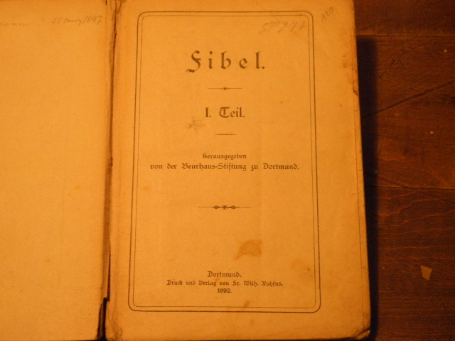BEURHAUS-STIFTUNG: (Hrsg.) Fibel. 1. Teil. Dortmund (Ruhfuss), 1892. 65 S. mit zahlr. Abb. HLn der Zeit. Ecke etwas bestoßen, eine Seite mit ca 4 cm Einriss, Papier altersbedingt gebräunt. EA der seltenen Dortmunder Fibel. Teistler 2319 kennt nur den Teil II von 1895.
