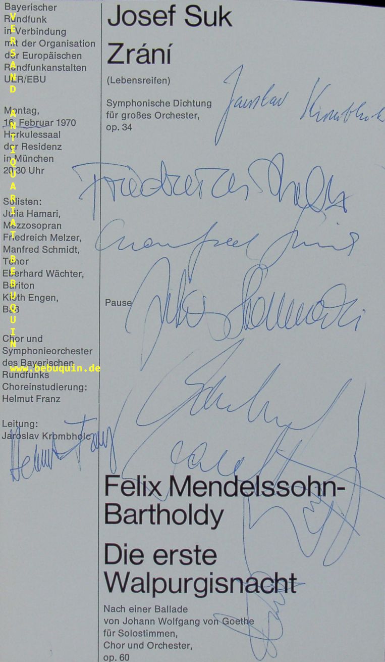 KROMBHOLC, Jaroslav (Dirigent) + HAMARI, MELZER, SCHMIDT, WÄCHTER, ENGEN: eigenhändig von allen signierte Programmseite. Für Zrani von Josef Suk. München (Herkulessaal), 16.2.1970. 25 x 14,5 cm. 1 Bl. Jaroslav Krombholc (Prague, 30 January 1918 – 16 July 1983) was a Czech conductor. (Wikipedia)