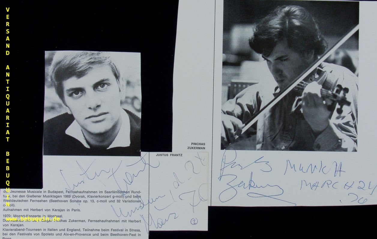 ZUKERMAN, Pinchas (Violinist) + FRANTZ, Justus (Pianist): 2 eigenhändig signierte und datierte Programmheftseiten. München (Herkulessaal), 24.3.1970. 17 x 19 cm. 3 Bl. Pinchas Zukerman (* 16. Juli 1948 in Tel Aviv) ist ein israelischer Violinist, Bratschist und Dirigent. Justus Frantz (* 18. Mai 1944 in Hohensalza, heute Inowroclaw) ist ein deutscher Pianist, Dirigent und Fernsehmoderator. (Wikipedia)