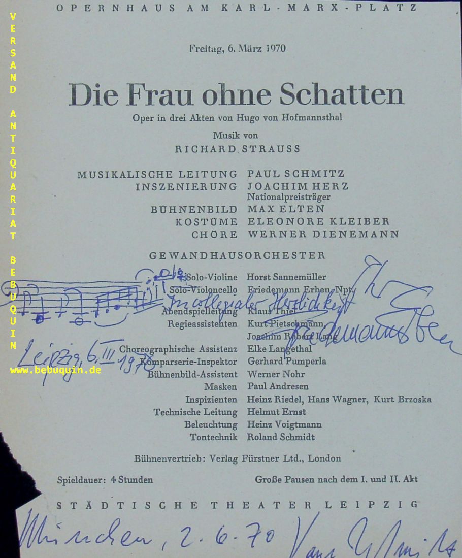 ERBEN, Friedemann (Cellist) + SCHMITZ, Paul (Dirigent): eigenhändig signierte und datierte Programmseite mit Notenzitat und Gruß: In collegialer Herzlichkeit Ihr Friedemann Erben sowie eigenhändig signiert und datiert vom Dirigent Paul Schmitz. Leipzig (Opernhaus), 2.6.1970. 8 x 12,5 cm. 1 Bl. Paul Schmitz (* 16. April 1898 in Hamburg; † 6. Februar 1992 in München) war ein deutscher Dirigent. Er war 1933–51 und erneut 1964–73 Generalmusikdirektor der Oper Leipzig, dazwischen Generalmusikdirektor des Staatsorchesters Kassel. (Wikipedia)