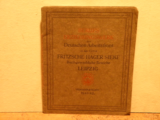LEIPZIG.– FRITZSCHE – HAGER – SIEKE.– Berufserziehungswerk der Deutschen Arbeitsfront. Leipzig. Winterhalbjahr 1941-42. Leipzig, 1941. Gr. 8°. 30 S. auf Bütten mit 12 mont. Fotografien. ill. OKart. neuwertig.