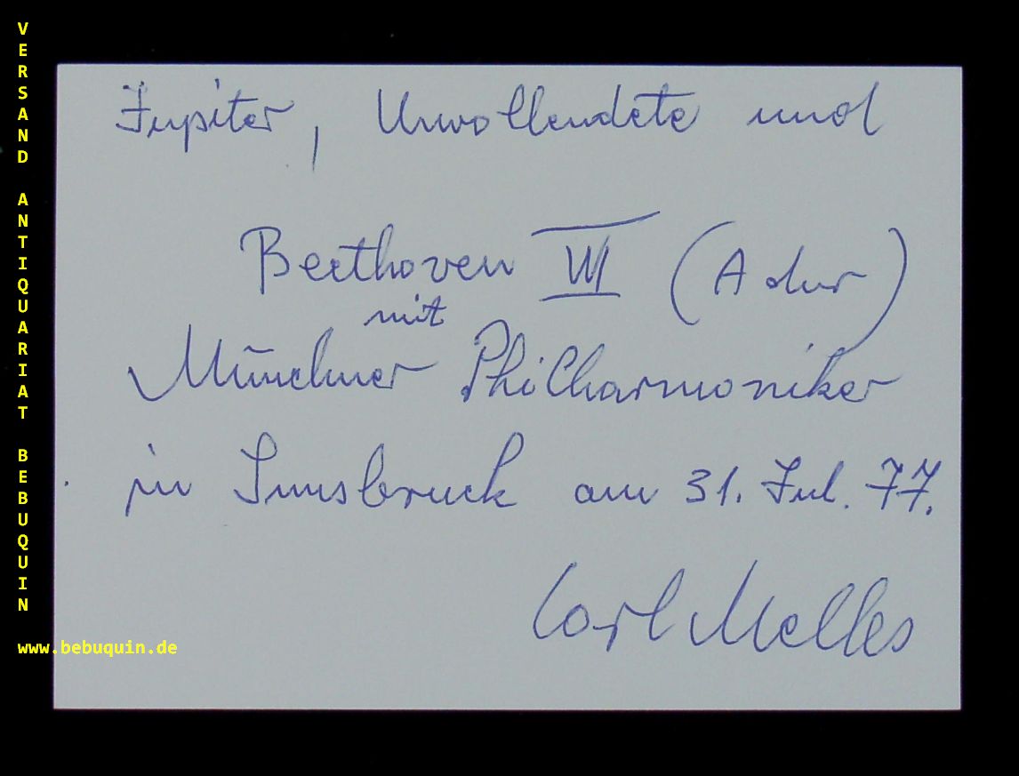 MELLES, Carl (Dirigent): eigenhändig signierte und datierte Autogrammkarte. Mit den Münchner Philharmonikern. Innsbruck, 31.7.1977. 10,5 x 14,5 cm. große Karteikarte. Carl Melles, ung. Károly Melles (* 15. Juli 1926 in Budapest; † 25. April 2004 in Wien) war ein österreichischer Dirigent ungarischer Herkunft. (Wikipedia)