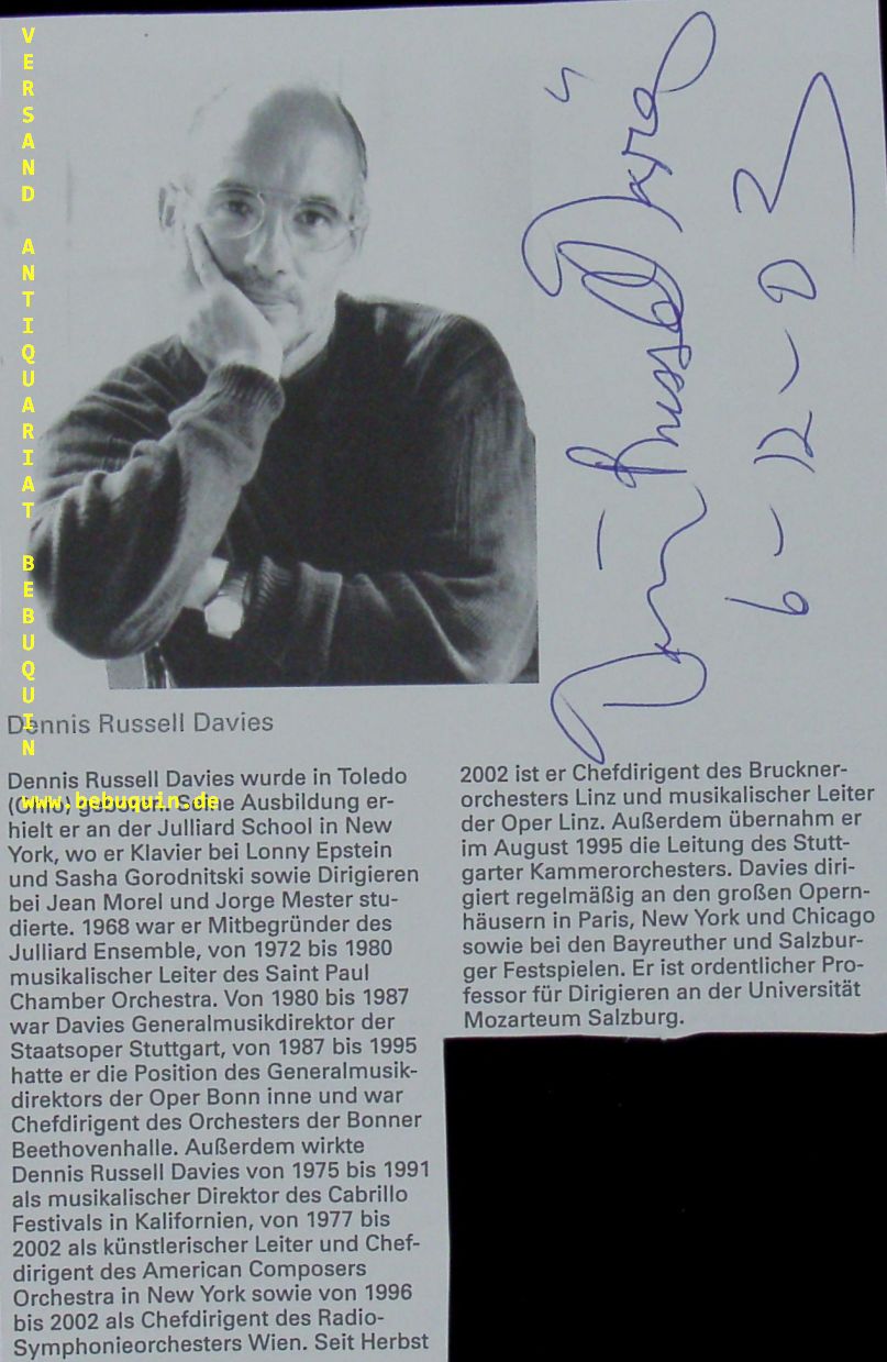 DAVIES, Dennis Russell (Dirigent): eigenhändig signierte und datierte Portraitseite. München (Herkulessaal), 6.12.2003. 18,5 x 12 cm. 1 Bl. Dennis Russell Davies (* 16. April 1944 in Toledo, Ohio, USA) ist ein US-amerikanischer Dirigent und Pianist. (Wikipedia)