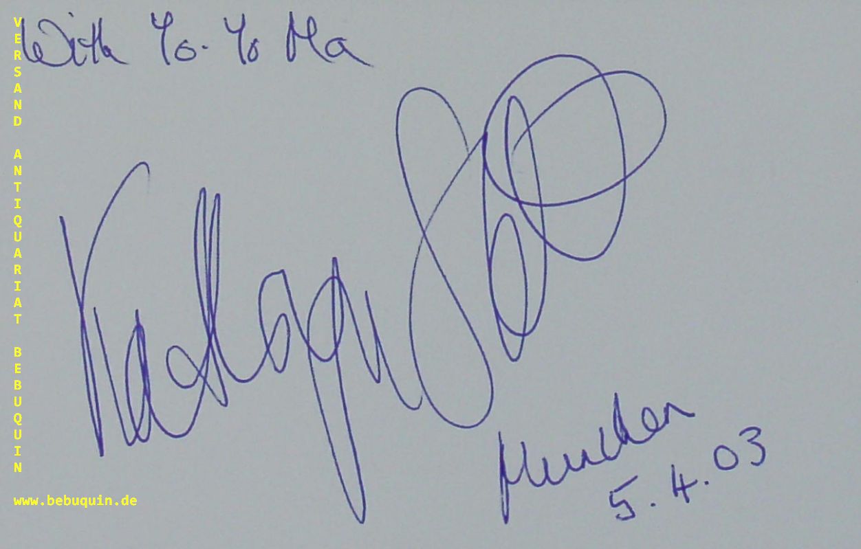 STOTT, Kathryn (Pianistin): eigenhändig signierte und datierte Autogrammkarte. München (Philharmonie), 5.4.2003. 8 x 12,5 cm. Karteikarte + Programmblatt mit Yo Yo Ma. Kathryn Stott (born 10 December 1958) is an English classical pianist who performs as a concerto soloist, recitalist and chamber musician. (Wikipedia)