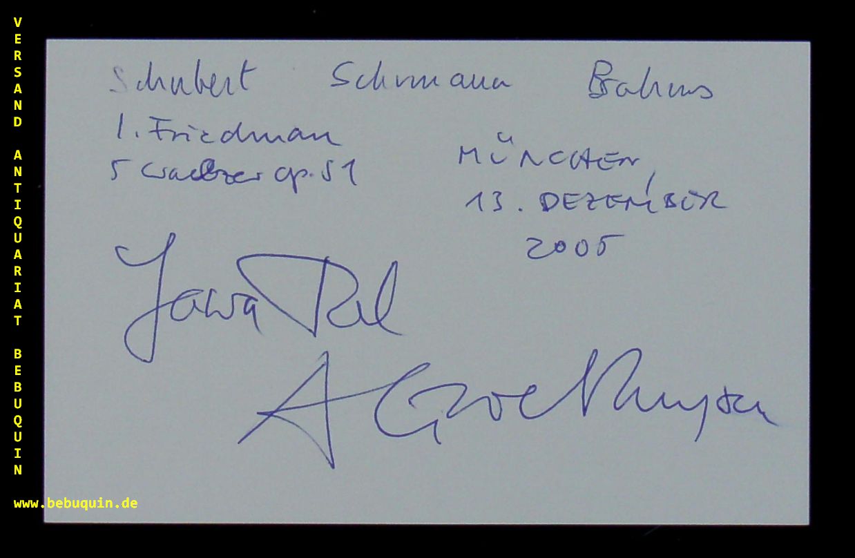 TAL, Yaara & GROETHUYSEN, Andreas (Klavierduo): eigenhändig von beiden signierte und datierte Autogrammkarte. München (Herkulessaal), 13.12.2005. 8 x 12,5 cm. Karteikarte mit Konzertprogramm. Als Duo Tal & Groethuysen gehören die israelische Pianistin Yaara Tal (* 27. Februar 1955 in Kfar Saba) und der deutsche Pianist Andreas Groethuysen (* 2. September 1956 in München) international zu den bekanntesten Klavierduos der Gegenwart. (Wikipedia)