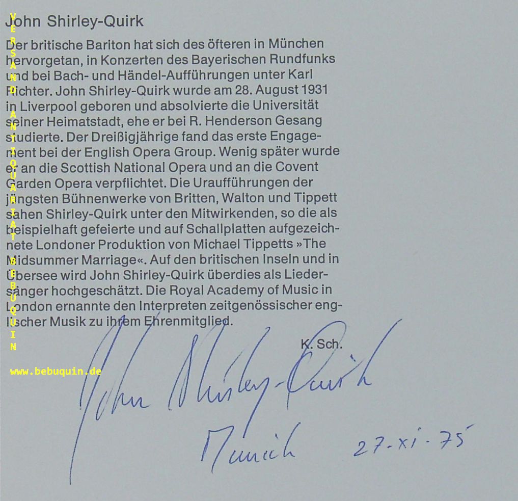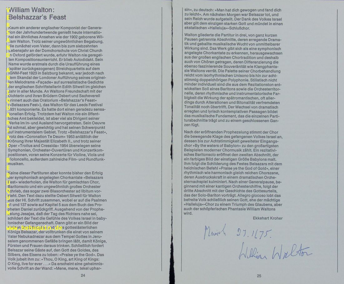 WALTON, William (Komponist) + SHIRLEY-QUIRK, John (Bariton): eigenhändig von beiden signiertes und datiertes Programmheft. München (Philharmonie), 27.11.1975. 26 x 15,5 cm. 4 Bl. Sir William Turner Walton(* 29. März 1902 in Oldham, Lancashire; † 8. März 1983 in Forio auf Ischia) war ein englischer Komponist und Dirigent. John Shirley-Quirk (* 28. August 1931 in Liverpool; † 7. April 2014 in Bath) war ein britischer Opern- und Oratoriensänger (Bassbariton). (Wikipedia)