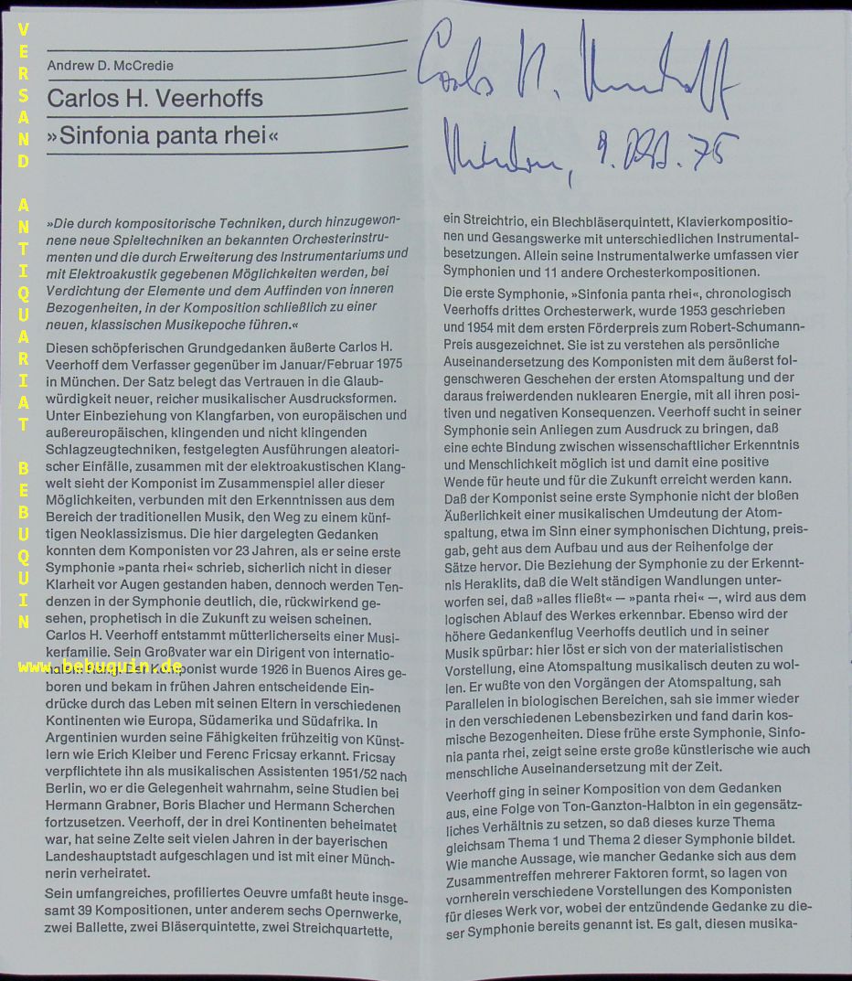 VEERHOFF, Carlos H. (Komponist): eigenhändig signierte und datierte Programmseite. München (Philharmonie), 9.10.1975. 25 x 21,5 cm. 3 Bl. Carlos Enrique Veerhoff (* 3. Juni 1926 in Buenos Aires; † 18. Februar 2011 in Murnau am Staffelsee) war ein deutsch-argentinischer Komponist von E-Musik. (Wikipedia)