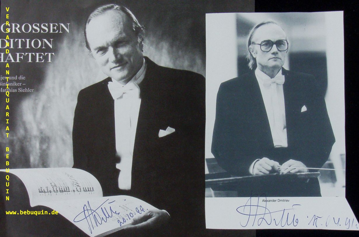 DMITRJEV, Alexander (Dirigent): 2 eigenhändig signierte und datierte Portraitseite. München (Herkulessaal), 1991 + 1999. 20 x 21 cm. 2 Bl. Aleksandr Sergeyevich Dmitriyev (born in Leningrad on 19 January 1935), is a Russian conductor of orchestral and choral music and opera. He has been director of the Symphony Orchestra of the Karel Autonomous Republic, and Principal Conductor of the Maly Academic Opera House in Leningrad. Since 1977 he has been Chief Conductor and Artistic director of the Academic Symphony Orchestra of the St. Petersburg Philharmonia. He has toured many countries worldwide performing a wide range of musical periods and styles. In 2005, he was awarded the Order of Honour for Merit in the field of Culture and Art by Vladimir Putin. (Wikipedia)