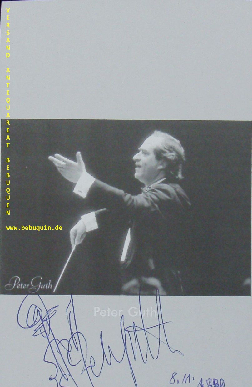 GUTH, Peter (Dirigent): eigenhändig signierte und datierte Portraitseite. München, 8.11.1999. 19 x 12 cm 1 Bl. die berühmte Geigen-Signatur mit leichtem Anschnitt. Die unvergleichliche Art, Musiker und Publikum mitzureißen und in der Tradition von Johann Strauss, auch Geige spielend zu dirigieren, hat Peter Guth international bekannt gemacht.