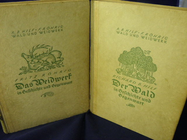 JAGD.– HILF, R. & F. RÖHRIG: Wald und Waidwerk in Geschichte und Gegenwart. 2 Bände. Potsdam (Athenäum), 1933 / 38. 4°. 3 Bll., 290 S. mit 217 Textabb. u. 5 Tafeln (davon 2 farb.) nach hist. Vorlagen; 3 Bll.,220 S. mit 174 Textabb. u. 11 Tafeln (davon 5 farb.) nach hist. Vorlagen. ill. OHLn. Kanten etwas gebräunt und berieben, Ex libris auf Innendeckel, kaum gelockert, insgesamt gut. recht seltene vollständige EA.