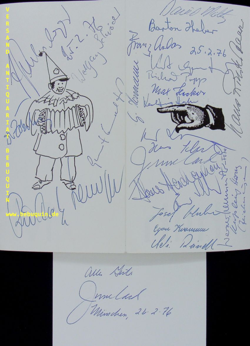 KEMPE, Rudolf (Dirigent) + FUCHSBERGER, Joachim + SCHMALFUSS, Gernot + ZÖBELEY, Hans Rudolf + CARD, June + RICHTER-HAASER, Hans + SCHLOTER, Elmar u.v.a.: eigenhändig von allen signiertes und datiertes Programmblatt. München (Herkulessaal), 25.2.1976. 21 x 41 cm. großes Faltblatt + 1 Karteikarte und Begleitblätter. = 7. Abonnementkonzert. Rudolf Kempe (* 14. Juni 1910 in Dresden; † 12. Mai 1976 in Zürich) war ein deutscher Dirigent. (Wikipedia)