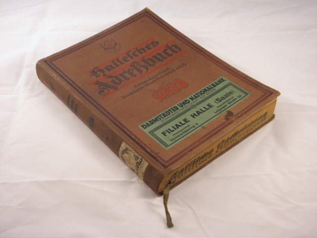 HALLE.– HALLESCHES ADRESSBUCH 1928.– Halle (Scherl), 1928. 4°. XII, 359, 148, 68, 64, 28 S. mit zwischengebundenen Papptiteln. ill. OHLn. Gelenke stabilisiert, Vorsätze etwas gebräunt, Stadtplan fehlt.
