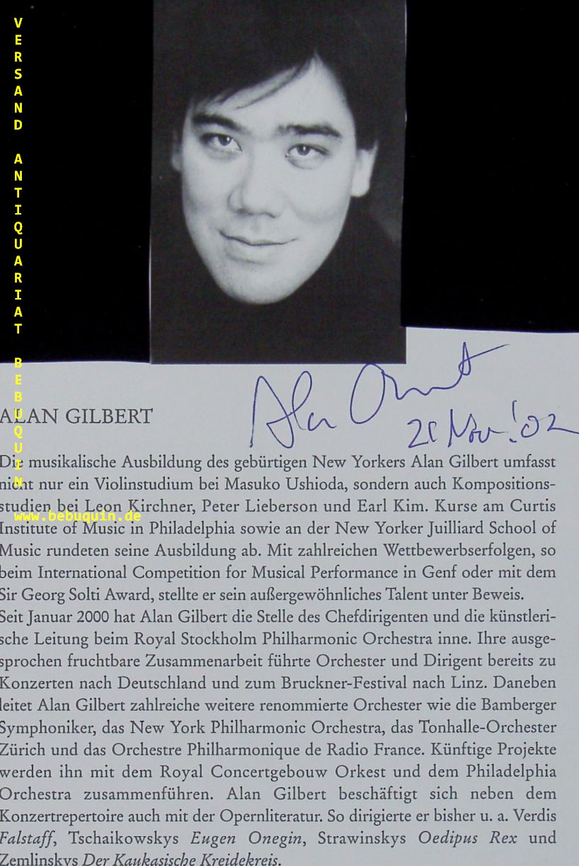 GILBERT, Alan (Dirigent): eigenhändig signierte und datierte Portraitseite. München (Herkulessaal), 21.11.2002. 19,5 x 13,5 cm. 1 Bl. Alan Gilbert (* 23. Februar 1967 in New York City) ist ein US-amerikanischer Dirigent. Er war von 2009 bis Juni 2017 Chefdirigent der New Yorker Philharmoniker und ist seit September 2019 Chefdirigent des NDR Elbphilharmonie Orchesters. (Wikipedia)