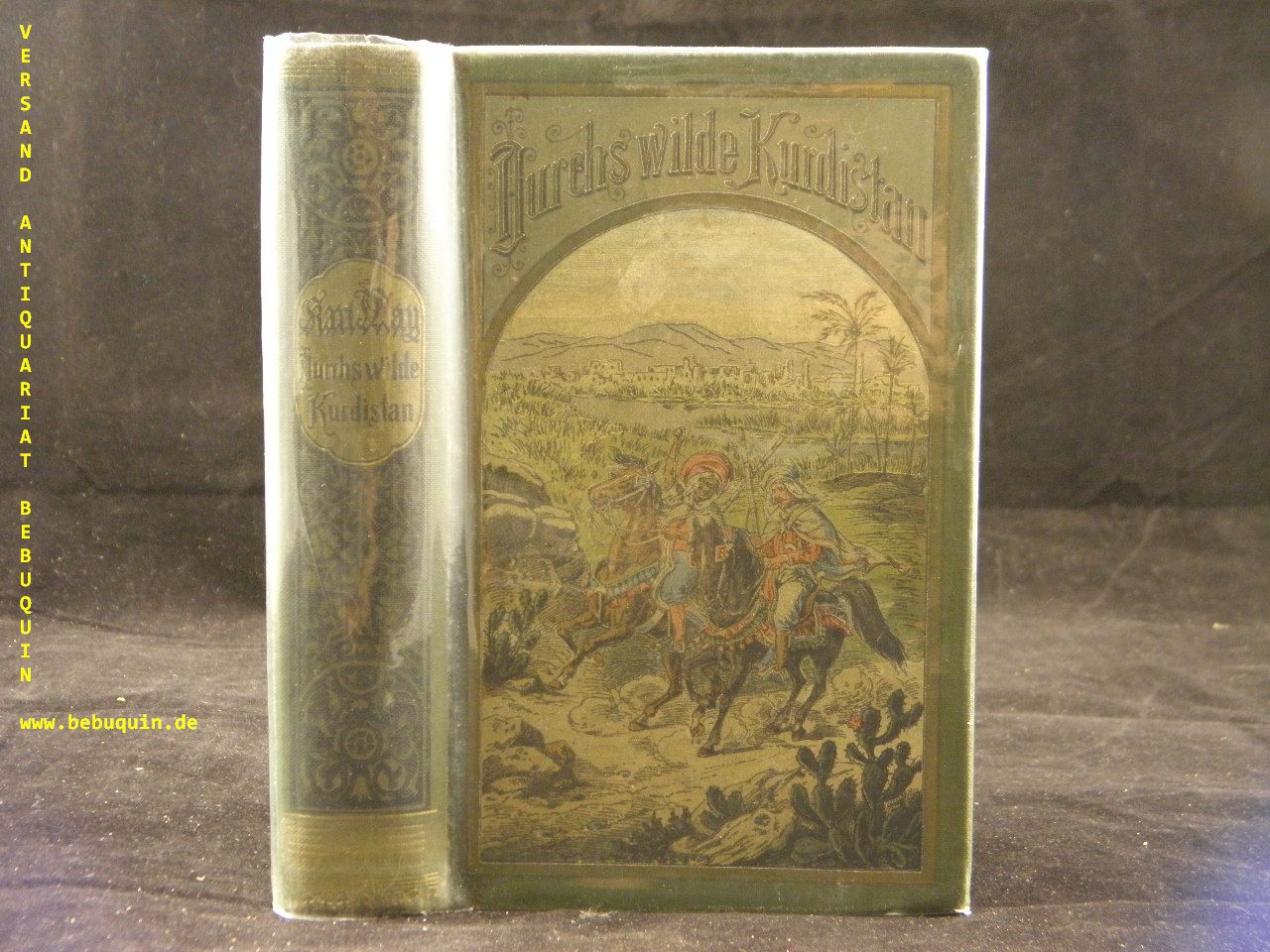 MAY, Karl: Durchs wilde Kurdistan. Reiseerzählungen. 56.– 60. Tsd. Freiburg (Fehsenfeld), (1908). 638 (1) S. farb. ill. OLn. (DB 39). Karl May Zeitungsausschnitt auf Vorsatz montiert, WaV, WaT = Gesammelte Reiseromane, Band II.