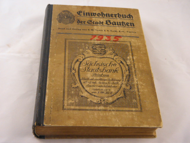 BAUTZEN.– MONSE, E.M. + RASCH, R.: (Hrsg.) Einwohnerbuch für Bautzen nebst Stadt- und Theaterplan. Bautzen (Rasch), 1935. Gr. 8°. XX, 18, 152, 112, 31, 32, 22 S. + der farb. Faltplan im Anhang. OHLn. Einband gebräunt mit handschriftlicher Jahresangabe in Rotstift. Seltenes Adressbuch.