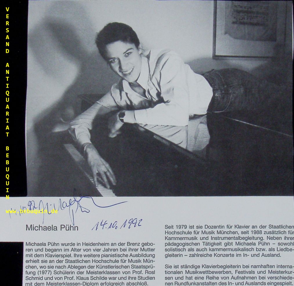 PÜHN, Michaela (Pianistin): eigenhändig signierte und datierte Portraitseite. München (Philharmonie), 14.10.1992. 18 x 17 cm. 1 Bl. Michaela Pühn. In Heidenheim an der Brenz geboren, erhielt Michaela Pühn den ersten Klavierunterricht im Alter von 4 Jahren bei ihrer Mutter und begann 1973 ihr Klavierstudium an der Münchner Musikhochschule. Seit Herbst 2009 ist Michaela Pühn Vizepräsidentin der Hochschule für Musik und Theater München.