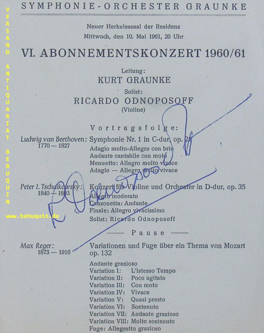 ODNOPOSOFF, Ricardo (Violinist): eigenhändig signierte Programmseite. München (Herkulessaal), 10.5.1961. 17,5 x 14 cm. 1 Bl. Ricardo Odnoposoff (* 24. Februar 1914 in Buenos Aires; † 26. Oktober 2004 in Wien) war ein aus Argentinien stammender österreichisch-amerikanischer Geiger des 20. Jahrhunderts. (Wikipedia)