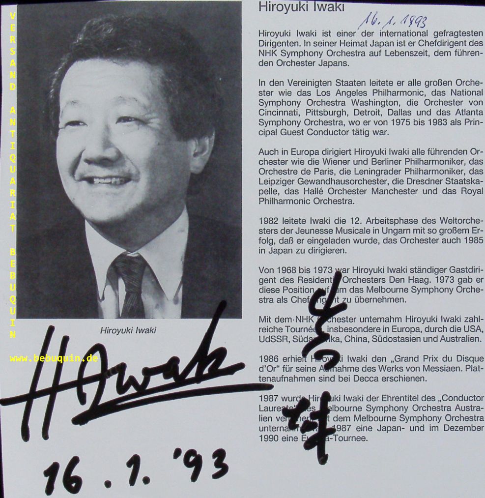 IWAKI, Hiroyuki (Dirigent): eigenhändig signierter (zweisprachig) und datierter Ausschnitt aus Programmheft. Leipzig, 16.1.1993. 18 x 17 cm. 1 Bl. Hiroyuki Iwaki (6 September 1932 – 13 June 2006) was a Japanese conductor and percussionist. (Wikipedia)